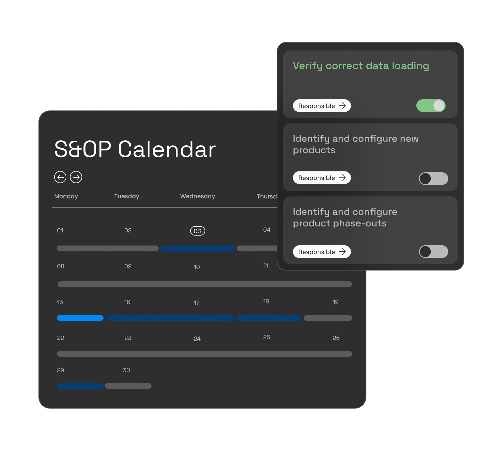 Download our calendar specifically designed for the Sales and Operations Planning (S&OP) process. This calendar will help you effectively structure and manage each phase of the S&OP process, from demand identification to plan review and adjustment. With our calendar, you can: